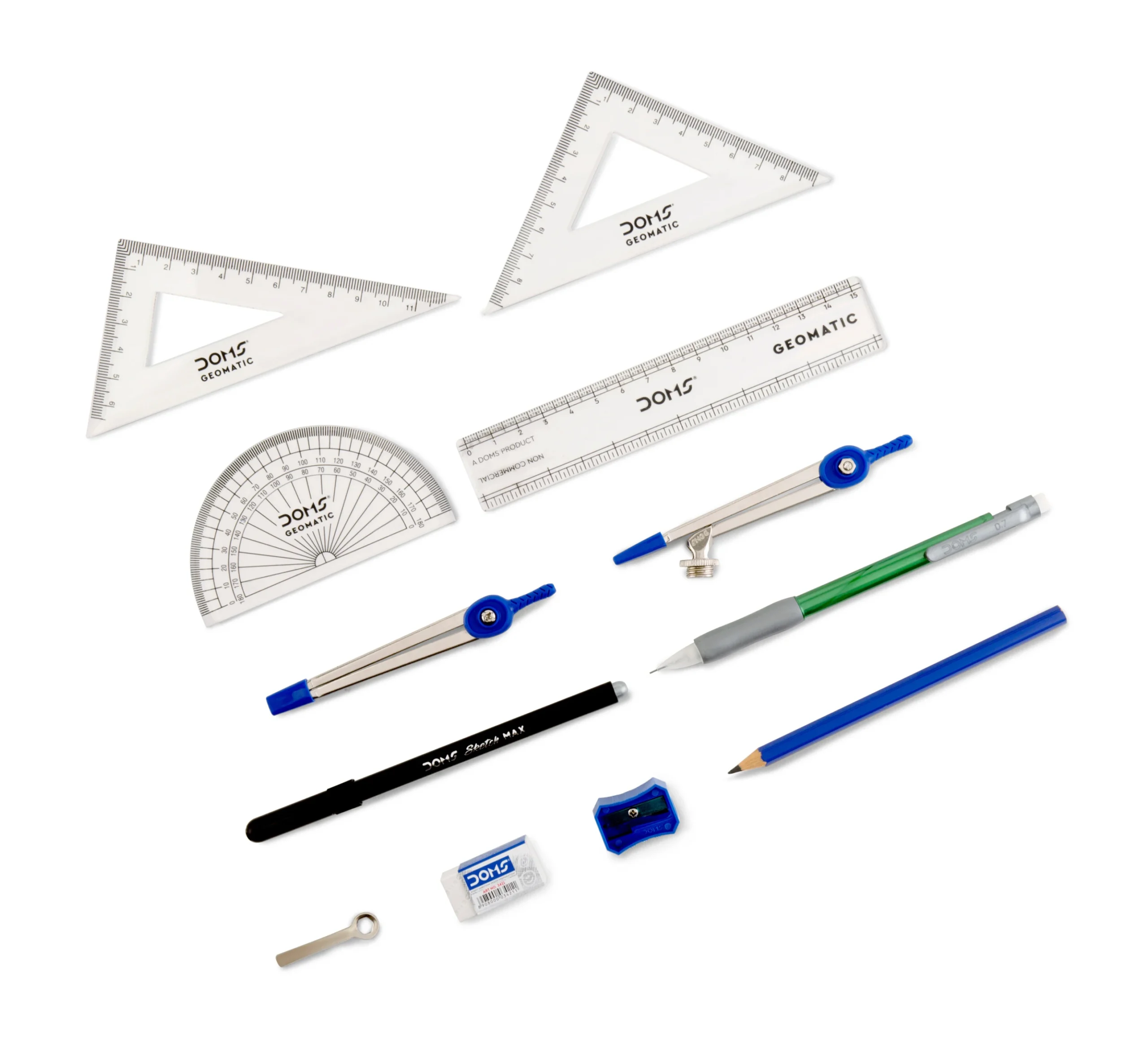 1N Compass, 1N Divider, 1N Set Square 45° & 60°, 1N Protractor 180°, 1N Scale 15cm, 1N Pencil, 1N Eraser, 1N Sharpener